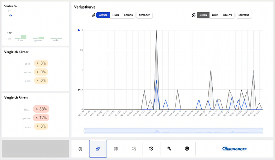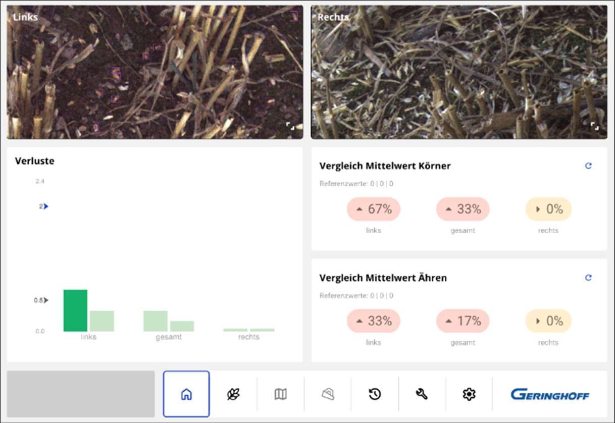 The annotated images themselves usually remain in the submenu pages, but can also be displayed and tracked on the screen. The evaluation of the yield potentials used can always be displayed separately for the left or right side of the header, or as a sum of both sides. The driver can decide whether to view individual or overall information in order to draw conclusions about different field and crop conditions.