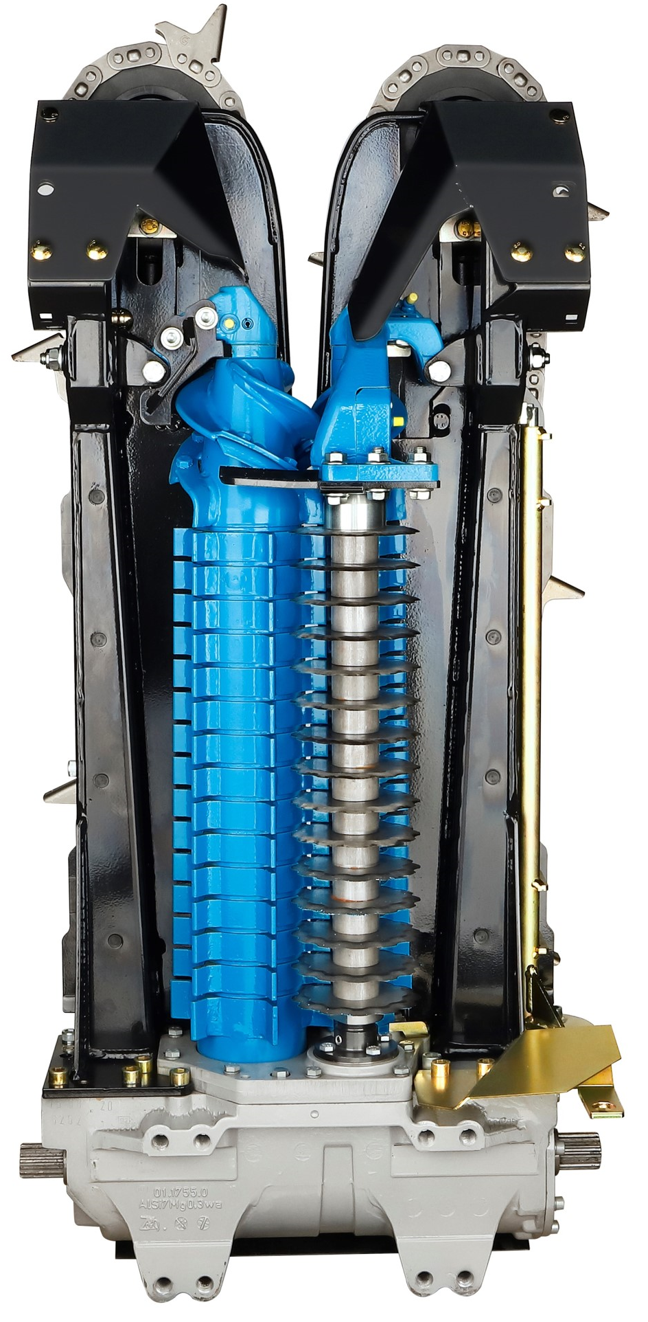 Two snapping rolls pull in the stalks, with deck plates stripping off the cobs. The stover is chopped by the cutter rotor which is fitted with 15 rotary knives. The cutting and fraying action is even more efficient as the rotor revolves against the feeding direction.